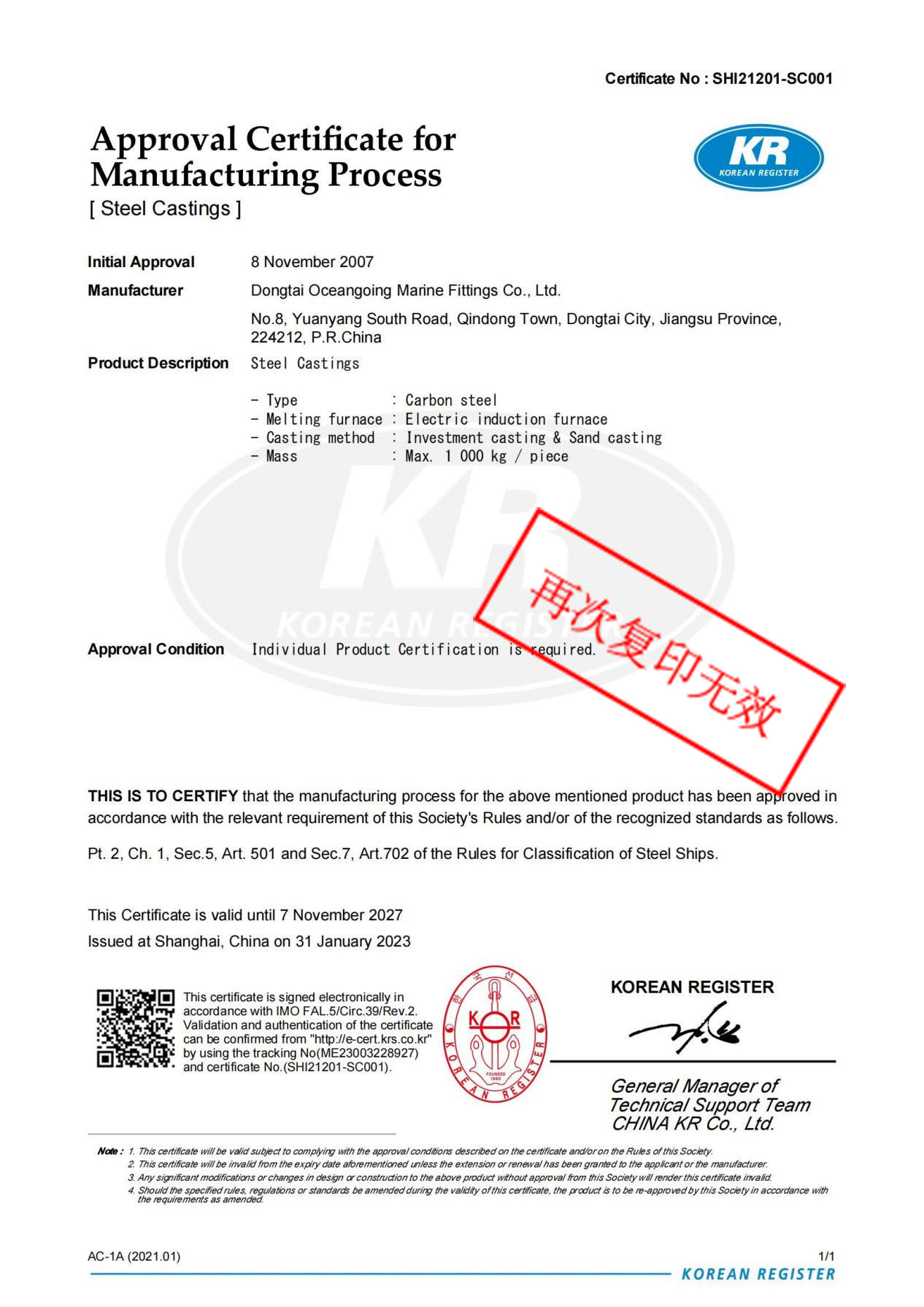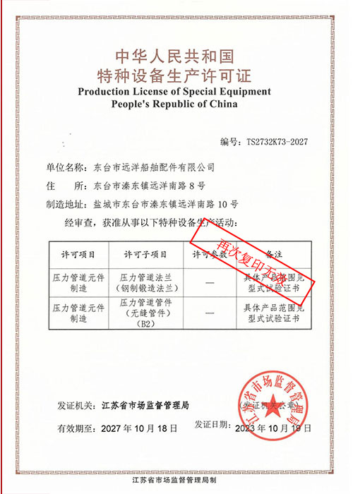 The company places great emphasis on management and has obtained ISO9001 Quality Management System Certification, ISO14001 Environmental Management System Certification, and ISO45001 Occupational Health and Safety Management System Certification, strictly adhering to international standards. Additionally, it has obtained Special Equipment Production License and Certificate of Measurement Assurance Confirmation Unit, and has been recognized by numerous classification societies such as China Classification Society (CCS) and Lloyd's Register (LR) for its factories and products. Its products are sold well both domestically and internationally, earning high recognition from customers.