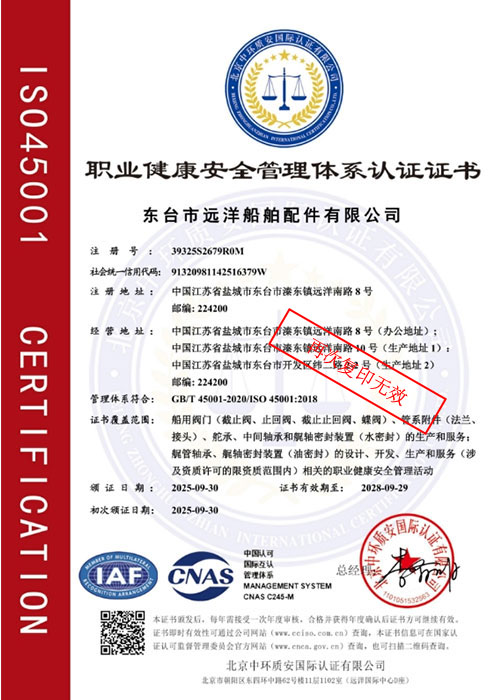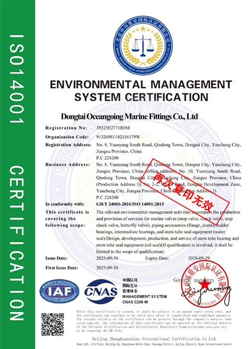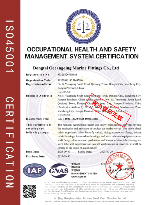 As a professional manufacturer specializing in marine product supporting, Dongtai Oceangoing Marine Fittings Co., Ltd. focuses on the research, development, and production of marine shafting, rudder system, and piping system (including various valves, fittings, and accessories). We are a national high-tech enterprise with independent intellectual property rights and a provincial-level metrological assurance confirmation unit, leading the industry in technology.